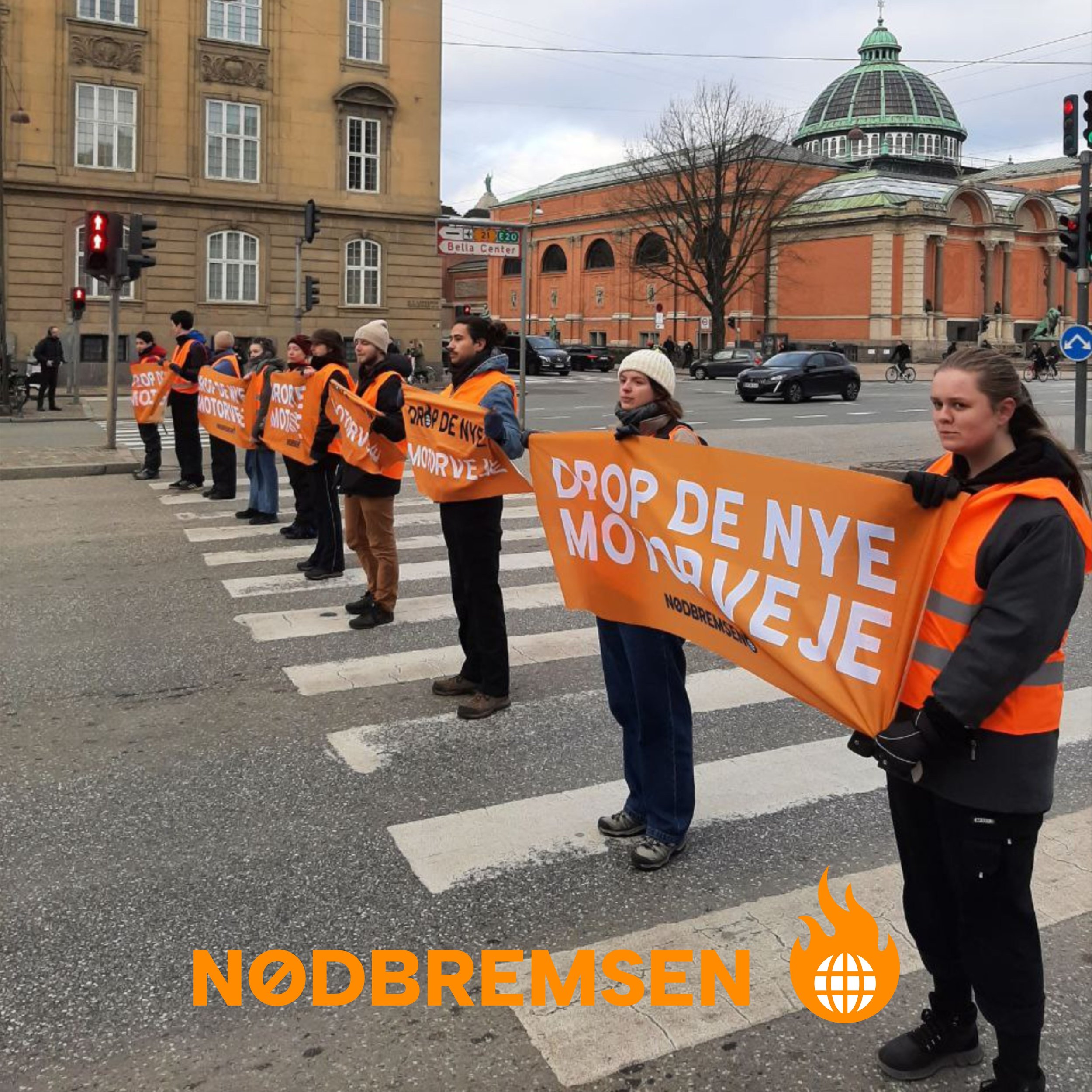 16 deltagere i Nødbremsen blokerede i dag krydset mellem H.C. Andersens Boulevard og Ny Kongensgade i modstand mod regeringens klimaødelæggende kurs.